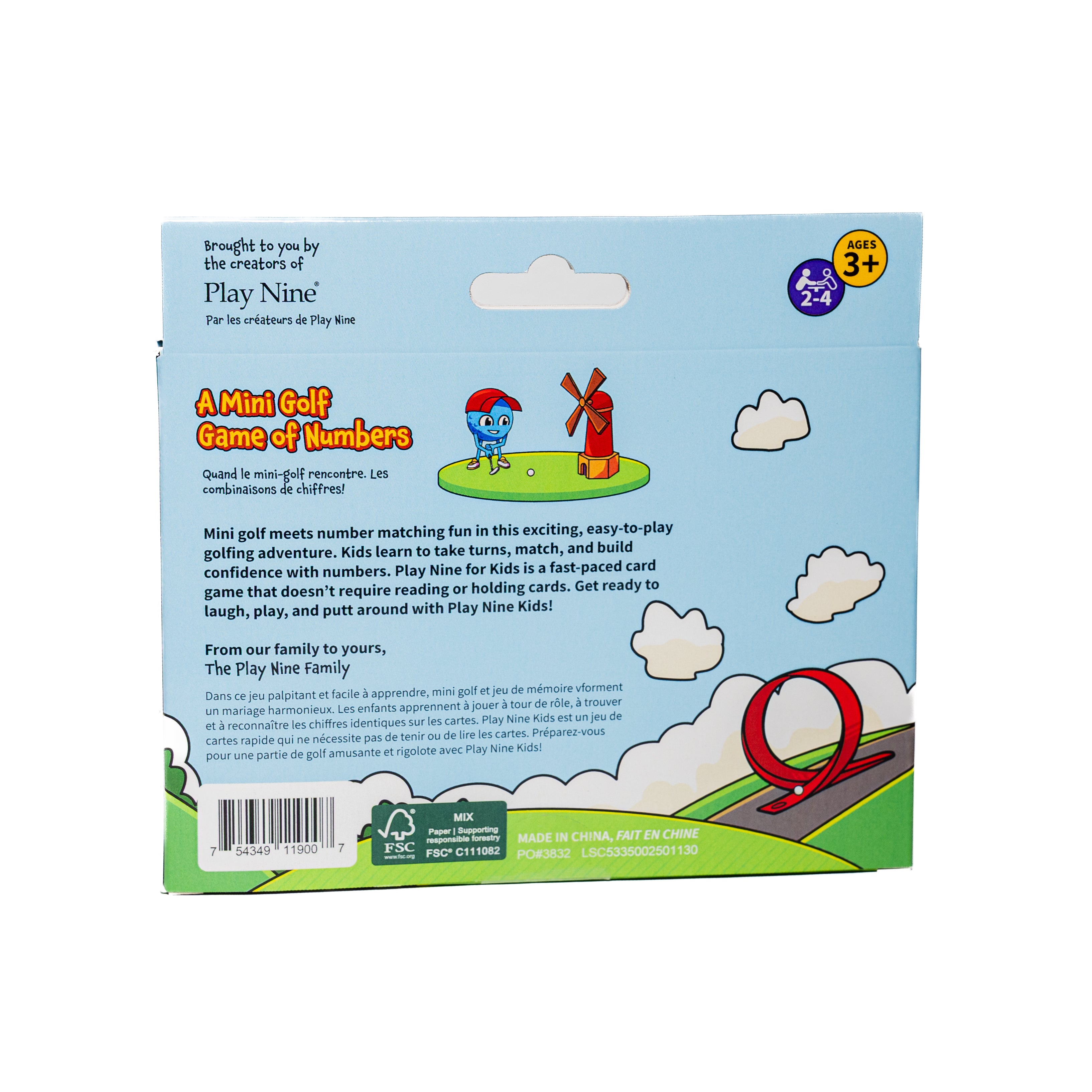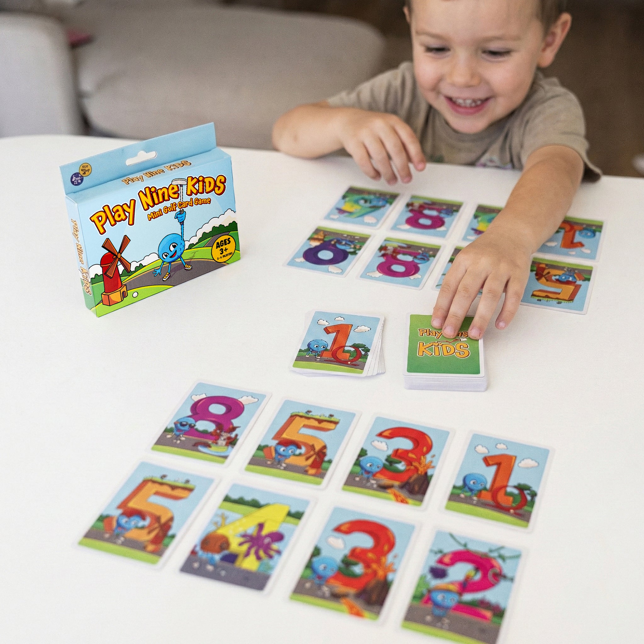 Mini Golf meets Number Matching fun in this exciting, easy-to-play golfing adventure. Kids learn to take turns, match, and build confidence with numbers. Play Nine KiDS is a fast-paced card game that doesn't require reading or holding cards. Get ready to laugh, play, and putt around with Play Nine KiDS!